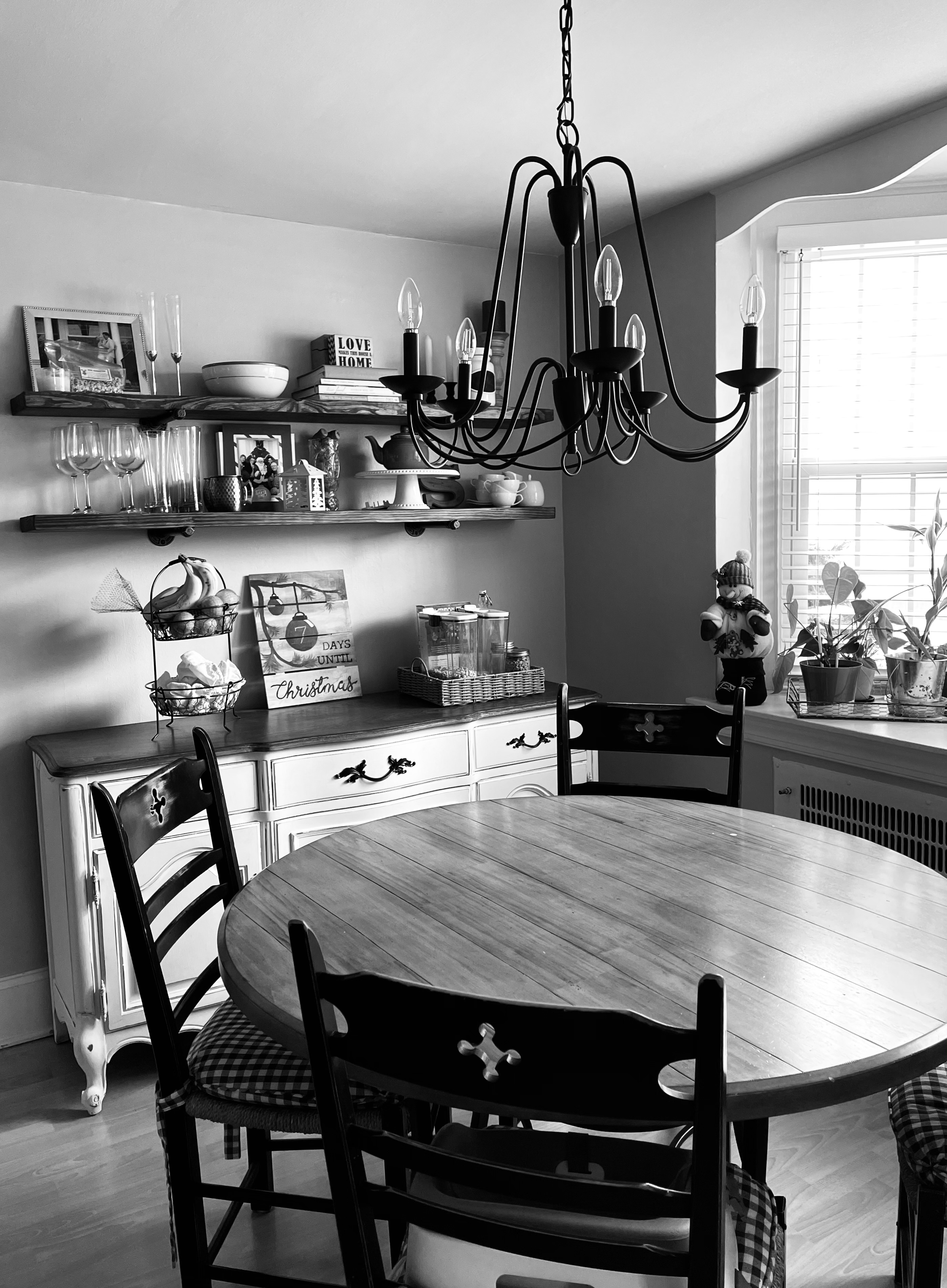 The dining table and chairs are second hand from Facebook marketplace, the buffet is an upcycled solid wood piece by a local woman and the shelving is reclaimed wood stained to match the buffet top.