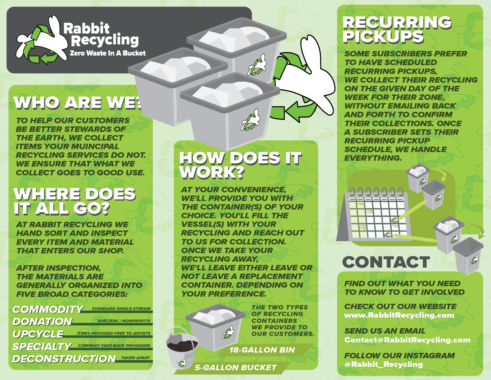 I think we can all agree that the trash and recycling process is not ideal. It’s hard to know where the stuff goes after it’s in your bin and whether or not items are actually recycled. This is why it’s important to first have the mentality of Reduce- reduce your consumption. But the truth is we all create waste and recycling is better than in a landfill. However, most recycling unfortunately does end there. That is why I like to support organizations that have the answers and want to make a difference. One such company is Rabbit Recycling, based right here in Philadelphia. Knowing HOW and WHAT to recycle is so important. Not a lot bugs me more than when I see people putting things in the recycling bin that don’t belong- aka greasy pizza boxes! Zoe Fuhrman, the project manager with Rabbit Recycling explained this exact thing; when people “wishcycle” (place materials in their bins in the hopes they will be recycled) they can damage equipment and create safety hazards for employees. Grocery bags, for example, cannot be recycled in single stream recycling because they will catch on the teeth of machinery and cause damage.