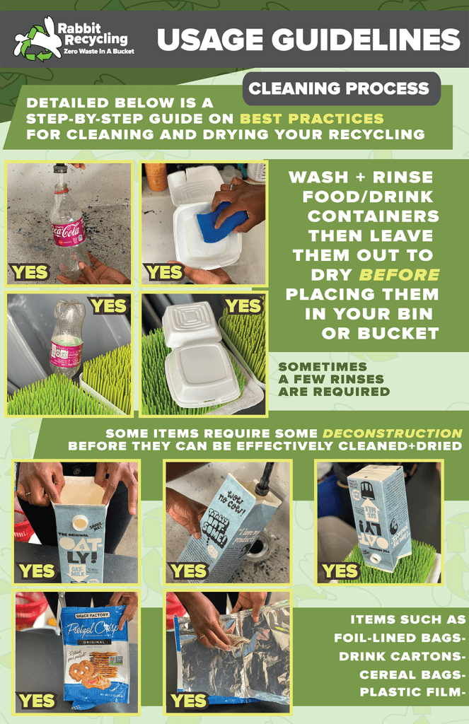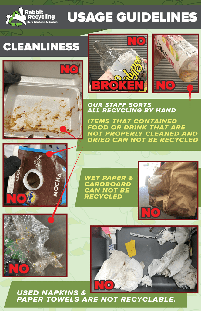 - We must all fully clean and dry our recyclables before putting them out for collection. In a municipal recycling program, if I put an olive oil container in the bin without cleaning it, when it gets added to the truck and leaks all over the contents, I could be contaminating all of my neighbors recycling as well and preventing it from being recycled–we have strict cleaning requirements at rabbit and we hand sort every item to ensure your materials won’t be contaminated by anyone else’s.