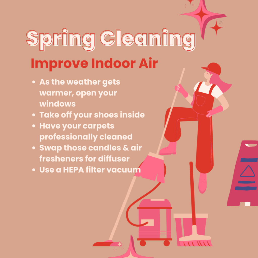 Secondly, make sure you are using non toxic cleaning solutions. This is a no brainer, but especially if you’re doors and windows are closed because of all this rain, cold air, or pollen. Every day cleaner can be made simply with water, vinegar and some essential oils for smell. You can dive deeper into more cleaning recipes through a quick online search. (or this older post)