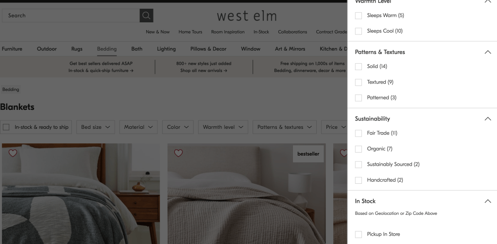 I have zero affiliation, but am a true fan of West Elm for their sustainability fabric options. When searching for bedding, look at the filter options! I have the European Flax Linen Blanket- definitely recommend! I just bought pillow covers for our living room to replace our eaten ones (eye roll…).