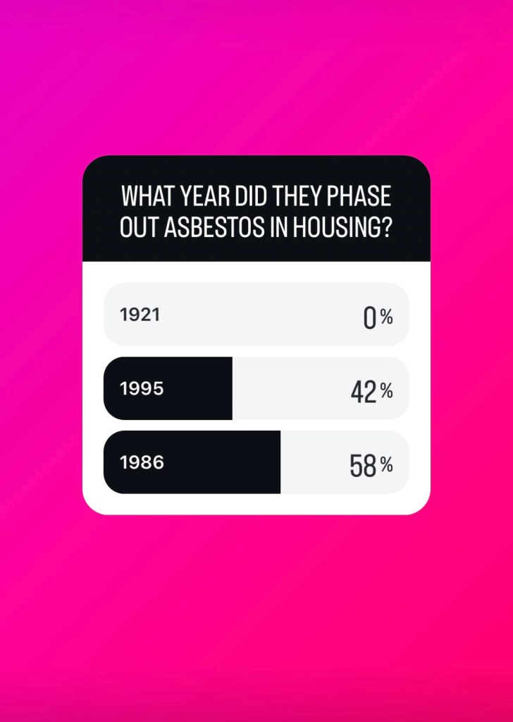 Did you know that asbestos was only phased out in housing as of 1986? And could potentially have been used later?! I polled my instagram followers to see if they knew this and to my surprise, the majority did assume in the 80’s! (I made have made it a little too easy to guess…) Personally, it seems pretty wild as it was known to be dangerous decades before.